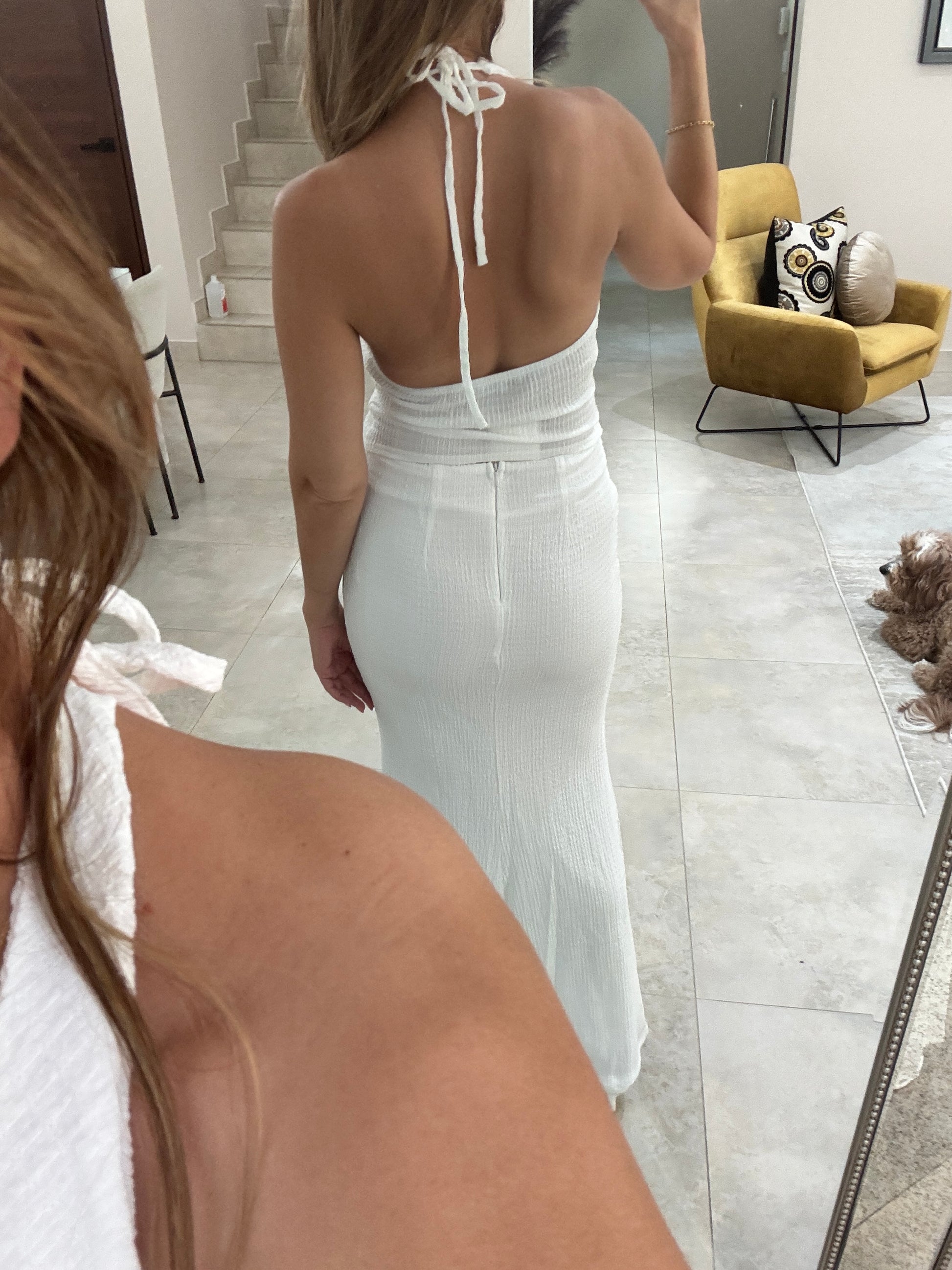 Knotted top and high waist skirt. Runs true to size.